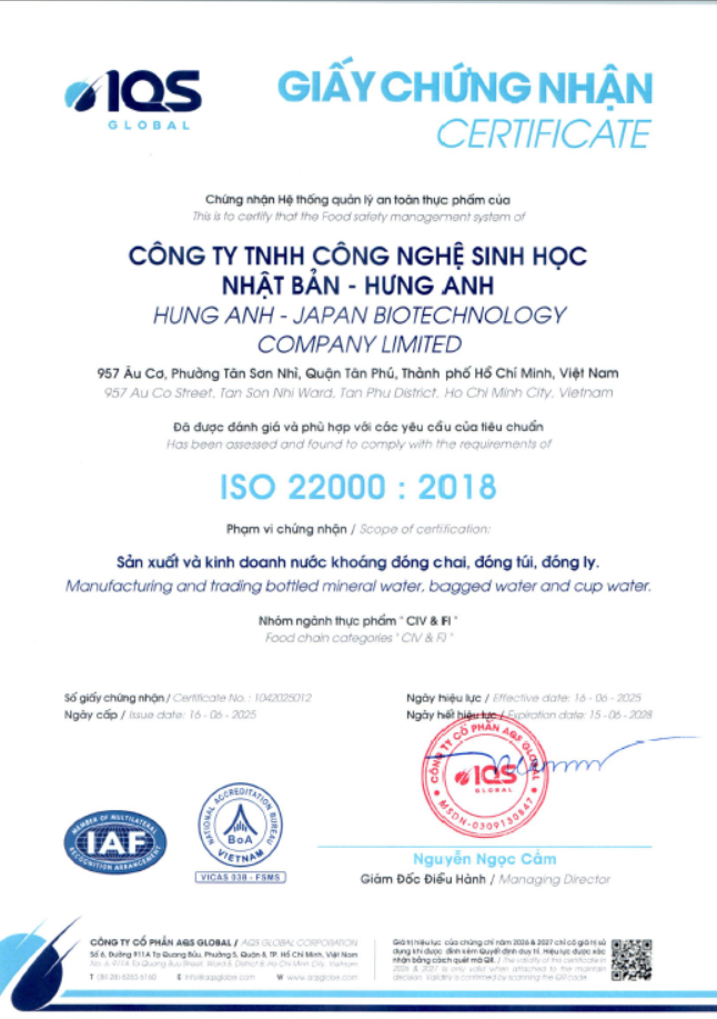 Đạt chuẩn an toàn thực phẩm quốc tế ISO 22000:2018, cam kết chất lượng và an toàn cho người tiêu dùng.