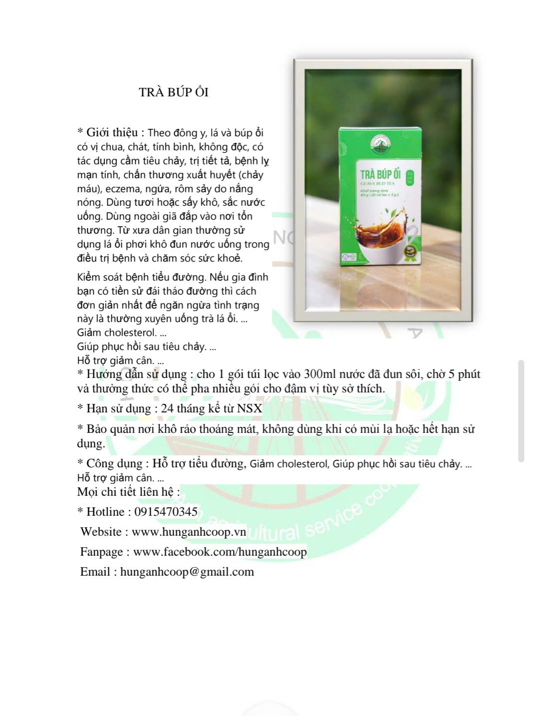Trà Búp ổi được sản xuất theo tiêu chuẩn HACCP vùng nguyên liệu tại địa phương. Sản phẩm thơm ngon dễ uống và có hương vị đặc trưng.